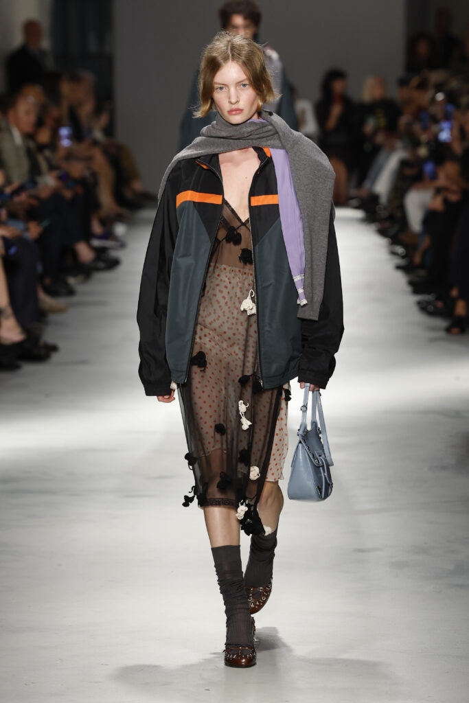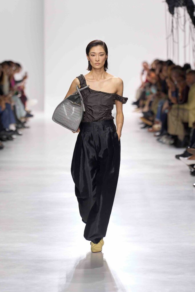 La collezione SS26 di N°21 gioca con sovrapposizioni calibrate e chiffon leggeri, integrando dettagli maschili che conferiscono equilibrio e contemporaneità. La passerella racconta una femminilità libera, fluida e attenta all’equilibrio tra estetica e praticità.